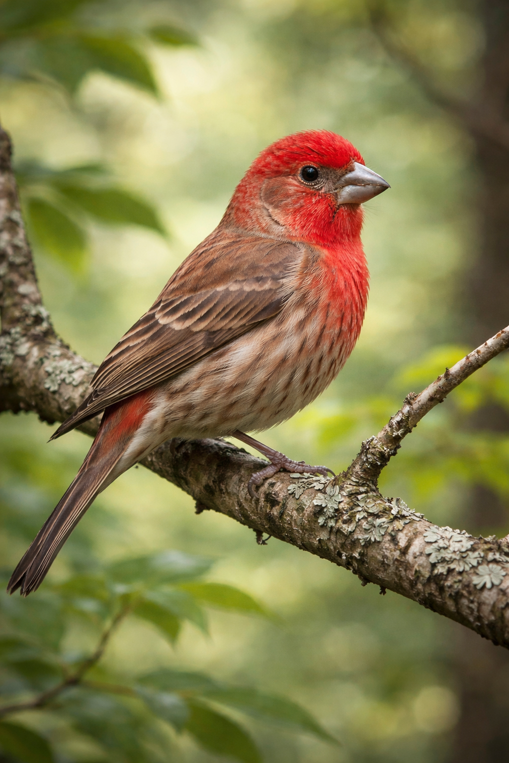 The House Finch is one of the most familiar red-toned birds in North America, especially in towns, suburbs, and cities. The male has red coloring on the forehead, throat, and upper chest, though the shade can vary from rosy pink to a deeper red. The rest of the body is brown and streaked. Females do not have red plumage and are mostly brown with blurry streaks.