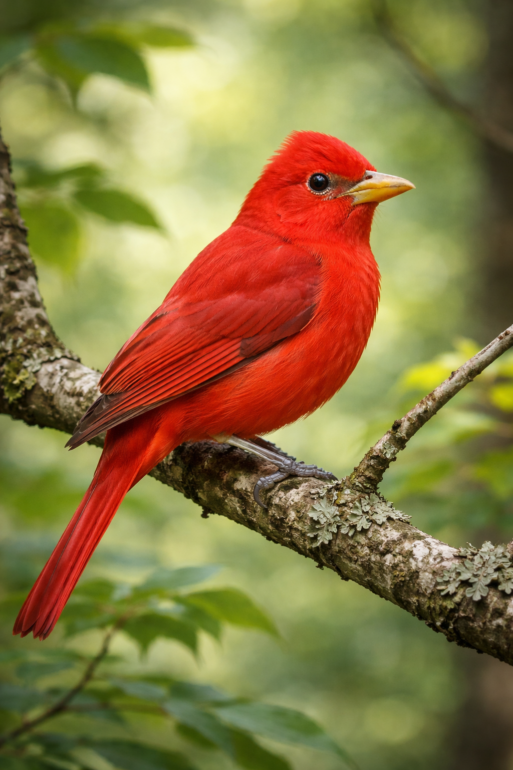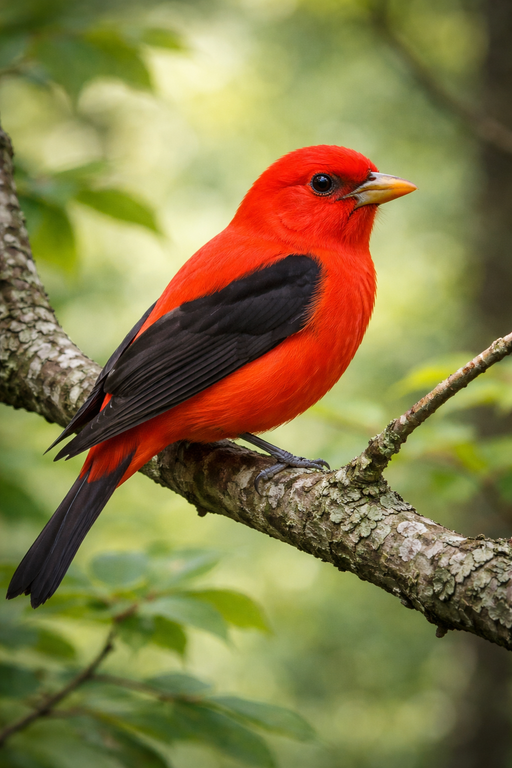 If the Summer Tanager is softly handsome, the Scarlet Tanager is downright striking. The breeding male has a brilliant scarlet-red body paired with jet-black wings and tail. The contrast is so bold that it almost looks unreal when sunlight hits the feathers just right. The female, on the other hand, wears olive-yellow tones that help her remain well camouflaged in the forest.